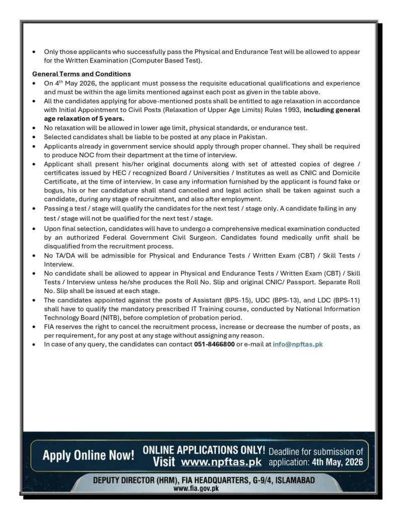 Federal Investigation Agency FIA Jobs 2026 have been officially announced, offering multiple vacancies across Pakistan, with the last date to apply being 04 May 2026. This is a great opportunity for candidates seeking a government career in a prestigious law enforcement agency. Applicants from all provinces can apply online through the official portal https://npftas.pk/.