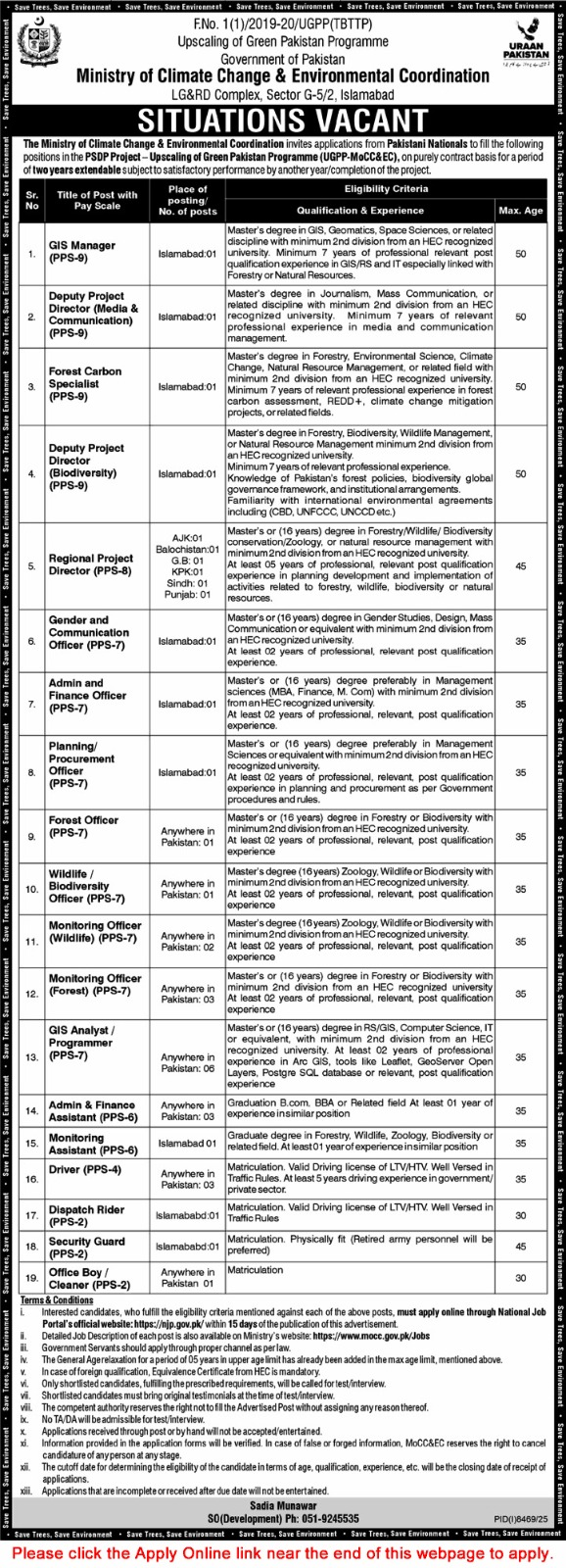 Ministry of Climate Jobs 2026 are announced under the PSDP project “Upscaling of Green Pakistan Programme (UGPP-MoCC&EC)”. These positions aim to support environmental sustainability, forestry, wildlife, and climate change initiatives across Pakistan.
